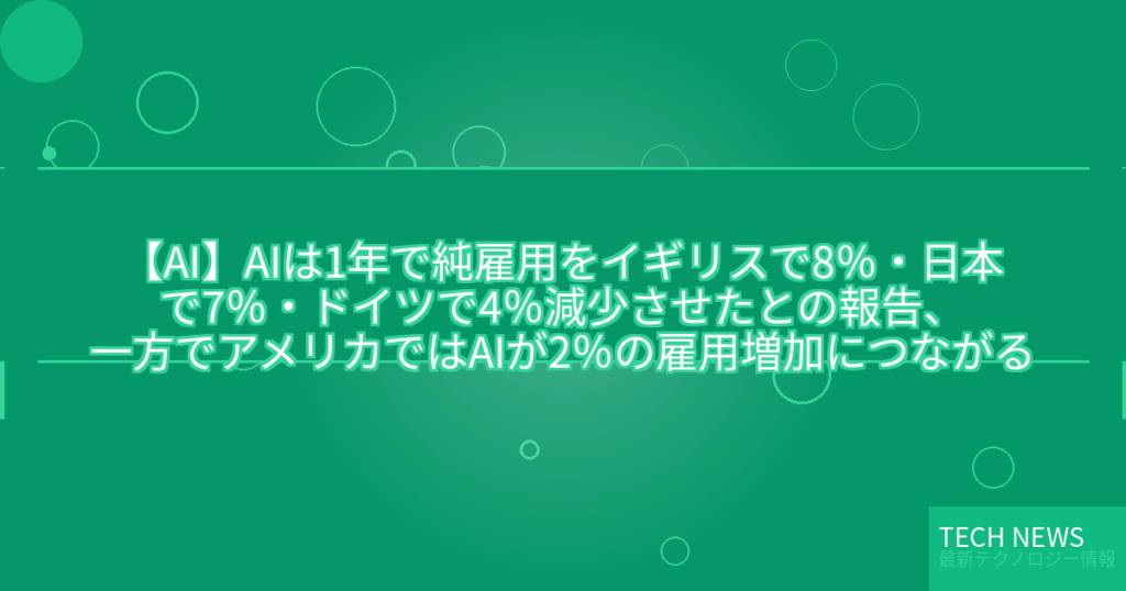 【AI】AIは1年で純雇用をイギリスで8%・日本で7%・ドイツで4%減少させたとの報告、一方でアメリカではAIが2%の雇用増加につながる