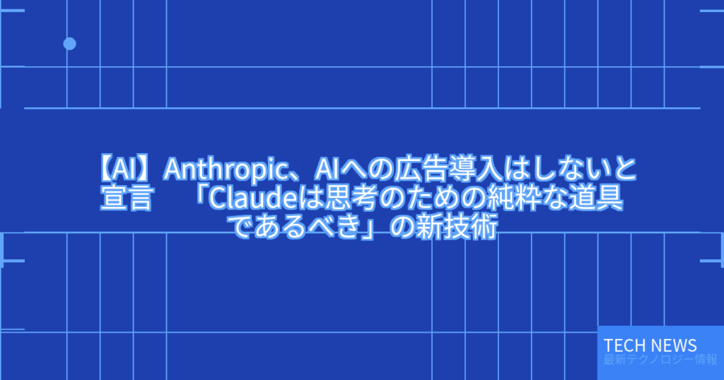 Anthropicは、「Claude」に広告を表示しない方針を再表明した。広告モデルは回答の中立性を損ない、ユーザーの集中を妨げると主張。GoogleやOpenAIがAIへの広告導入を加速させる中、同社はユーザーの利益を最優先する「思考の道具」としての純粋性を追求し、広告主ではなくユーザーと直接向き... -