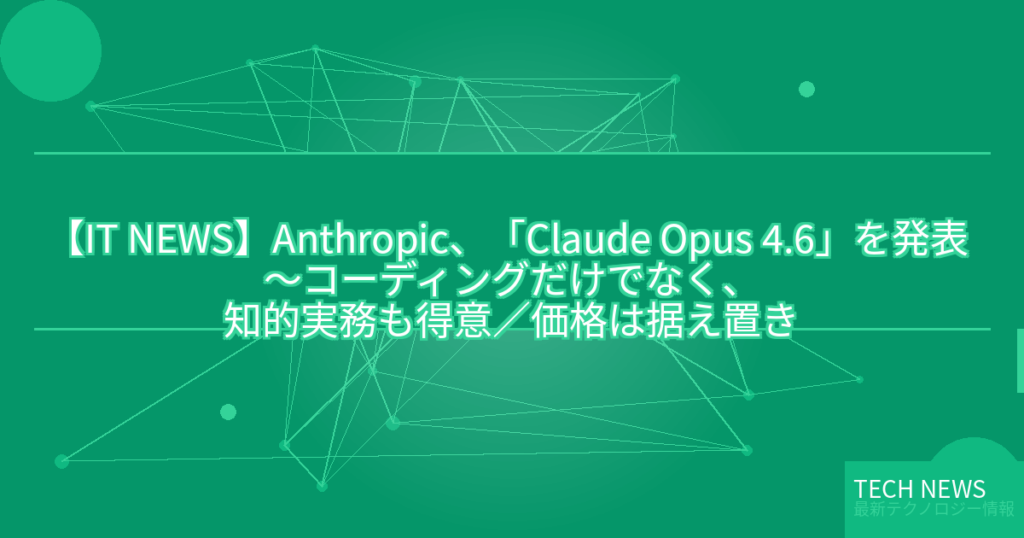 【IT NEWS】Anthropic、「Claude Opus 4.6」を発表 ~コーディングだけでなく、知的実務も得意/価格は据え置き