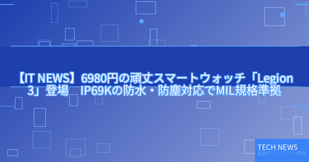 【IT NEWS】6980円の頑丈スマートウォッチ「Legion 3」登場 IP69Kの防水・防塵対応でMIL規格準拠