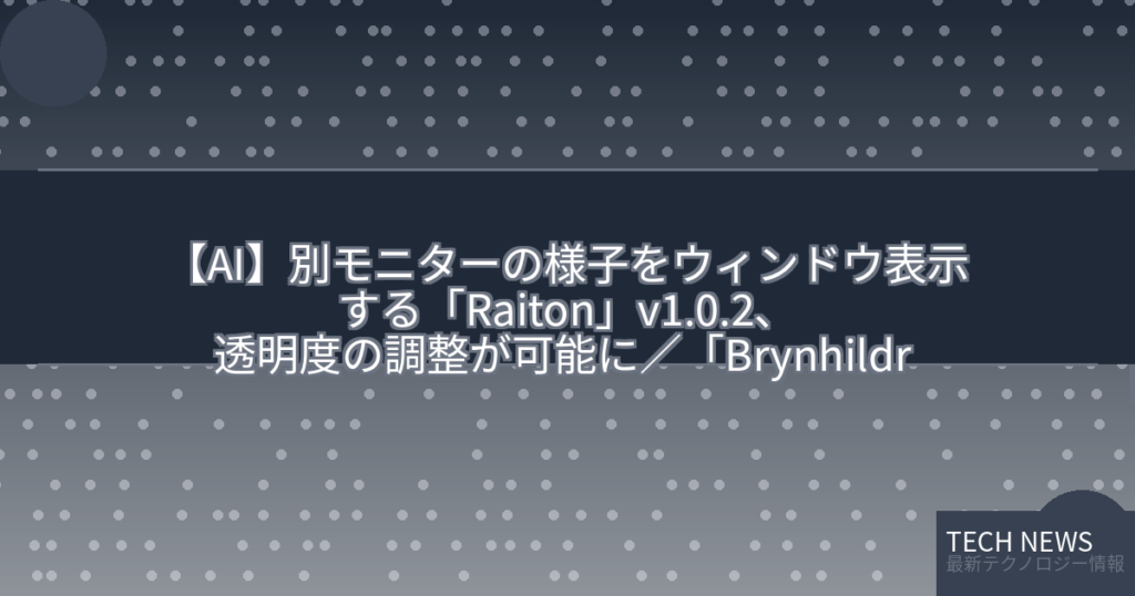 【AI】別モニターの様子をウィンドウ表示する「Raiton」v1.0.2、透明度の調整が可能に/「Brynhildr Free」の姉妹アプリ。タイトルバーやフレームを非表示にする機能もが変える未来