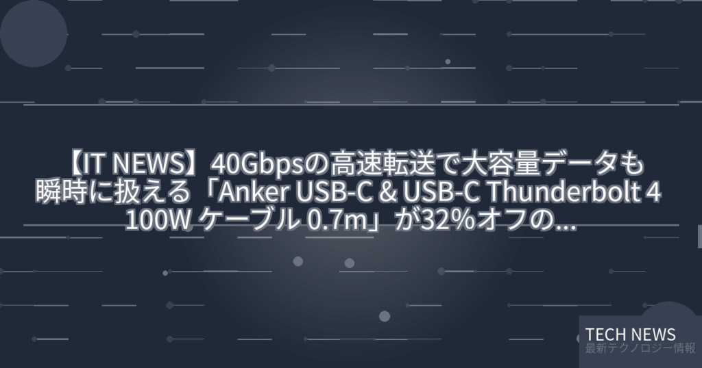 【IT NEWS】40Gbpsの高速転送で大容量データも瞬時に扱える「Anker USB-C & USB-C Thunderbolt 4 100W ケーブル 0.7m」が32%オフの2990円に