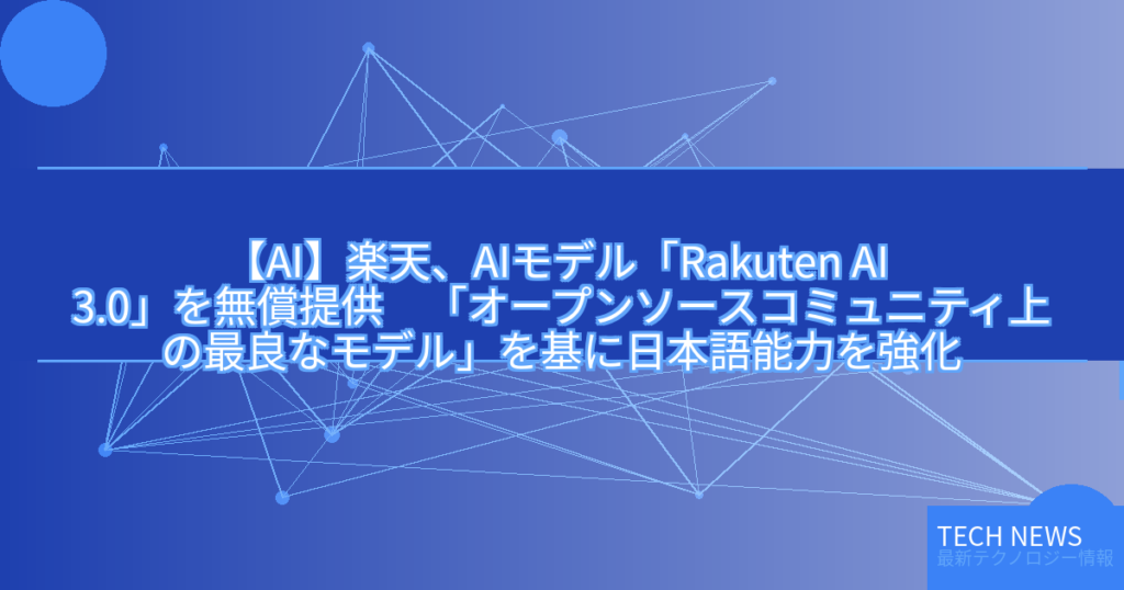 楽天は、国内有数の日本語特化型AIモデル「Rakuten AI 3.0」の提供を開始した。本モデルは約7000億パラメーターのMoEアーキテクチャを採用し、日本語性能で高い評価を得ている。無償公開を通じて国内のAI開発加速と技術支援を目指す。 -
