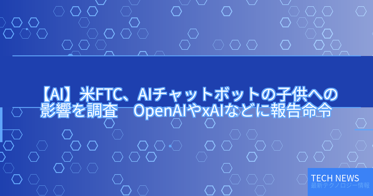 米FTCが、AIチャットボットの子供への影響に関する調査を開始した。OpenAIやxAIなど7社に対し、安全性やデータ収集に関する報告を命令した。特にプライバシー保護法COPPAへの準拠を注視しており、違反があれば利用停止を求める可能性がある。