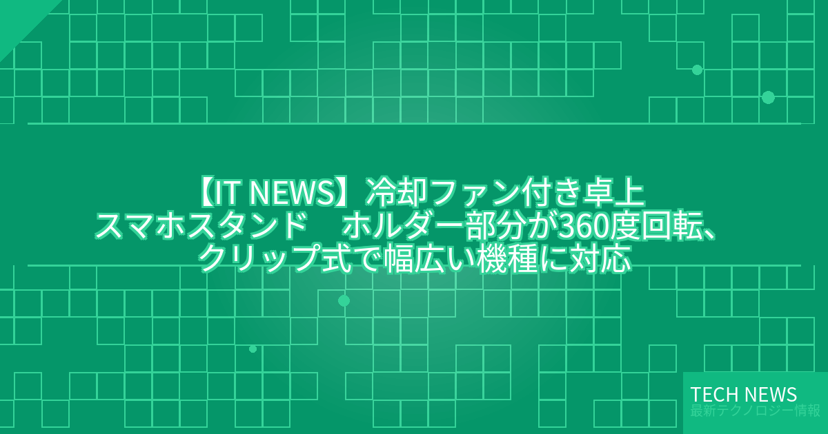 記事タイトル:冷却ファン付き卓上スマホスタンド ホルダー部分が360度回転、クリップ式で幅広い機種に対応