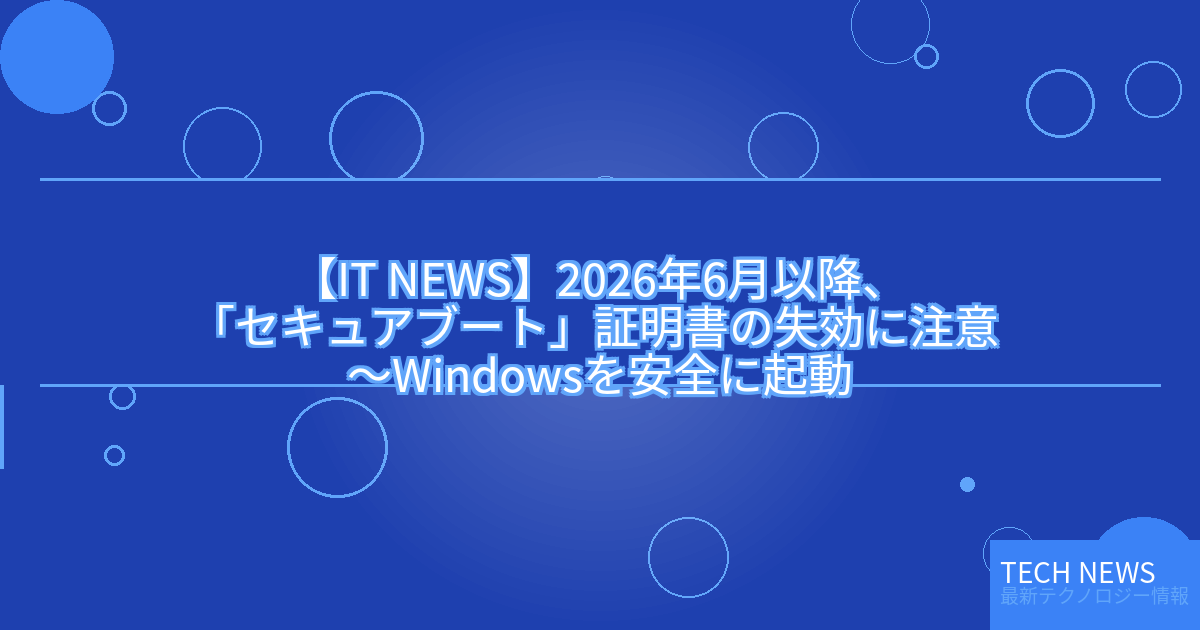 今回のニュースは、Microsoftが2026年6月以降、一部のセキュアブート証明書の失効を予告したことが背景にあります。これにより、対象となるデバイスではOSの起動に支障が生じる可能性があるため、ユーザーへの注意喚起が行われています。