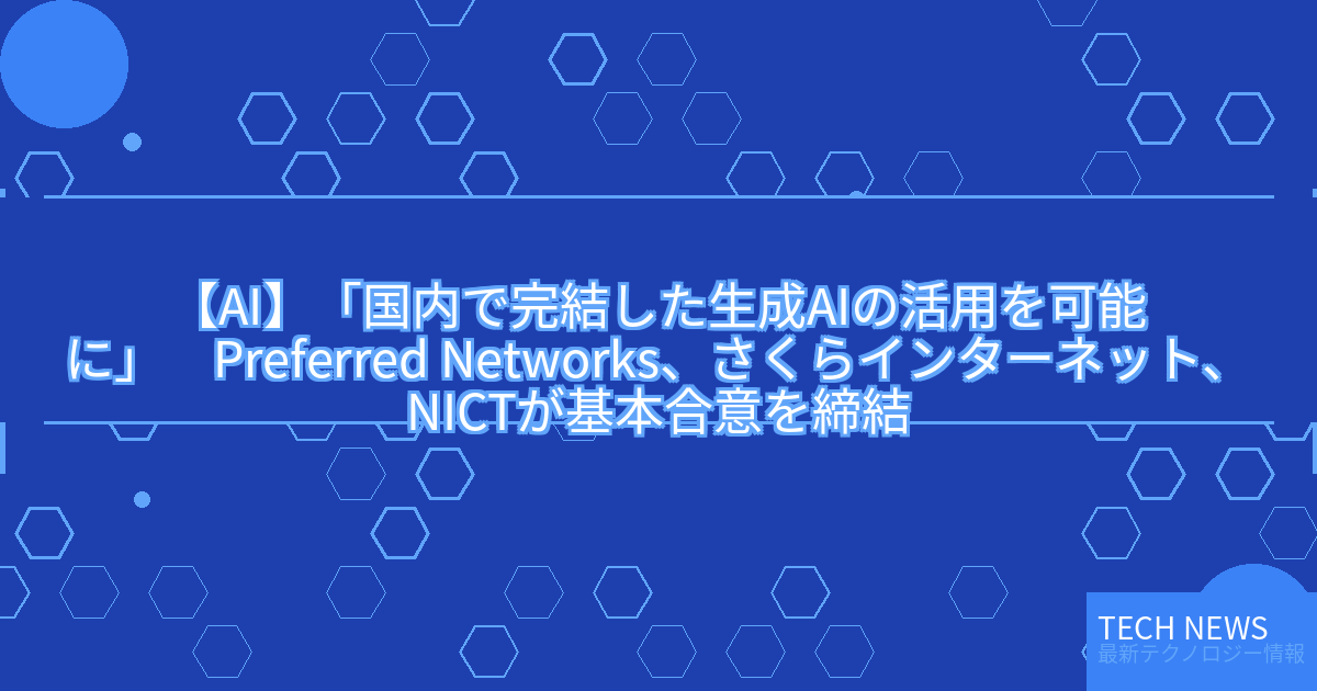 記事タイトル:「国内で完結した生成AIの活用を可能に」 Preferred Networks、さくらインターネット、NICTが基本合意を締結