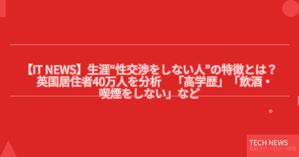【IT NEWS】生涯“性交渉をしない人”の特徴とは? 英国居住者40万人を分析 「高学歴」「飲酒・喫煙をしない」など