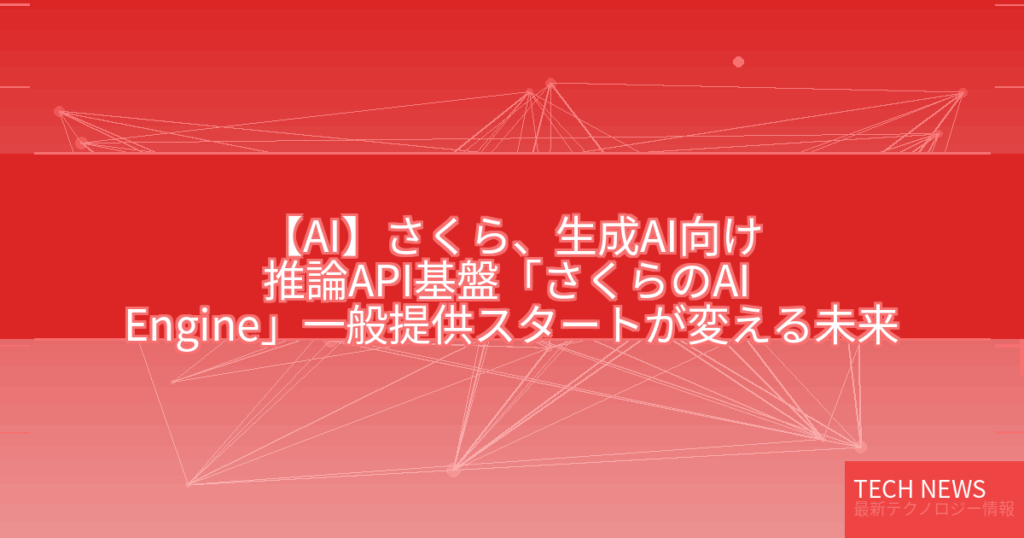 最新ニュースとその考察 📰 元記事の内容 記事タイトル:さくら、生成AI向け推論API基盤「さくらのAI Engine」一般提供スタート 記事概要: 情報源: 元記事を読む → 🔍 技術的背景と詳細解説 さくらのAI Engineは、生成AIモデルの推論処理... -