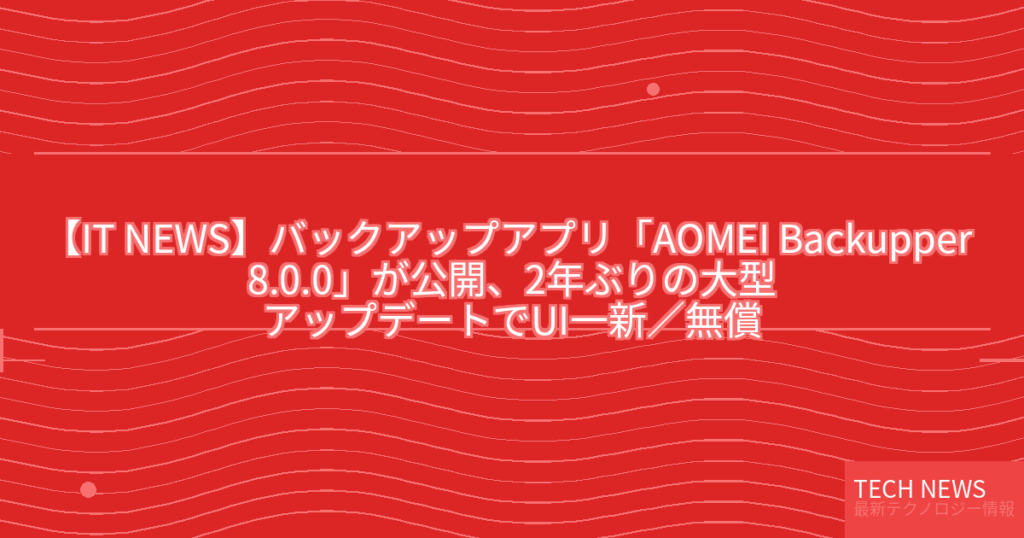 【IT NEWS】バックアップアプリ「AOMEI Backupper 8.0.0」が公開、2年ぶりの大型アップデートでUI一新/無償の「Standard」エディションもあり