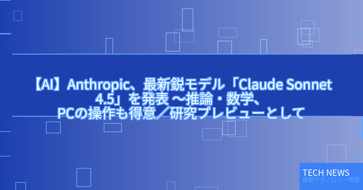 ・元記事タイトル:Anthropic、最新鋭モデル「Claude Sonnet 4.5」を発表 ~推論・数学、PCの操作も得意/研究プレビューとして革命的開発AI「Imagine with Claude」も限定提供、5日間のみ