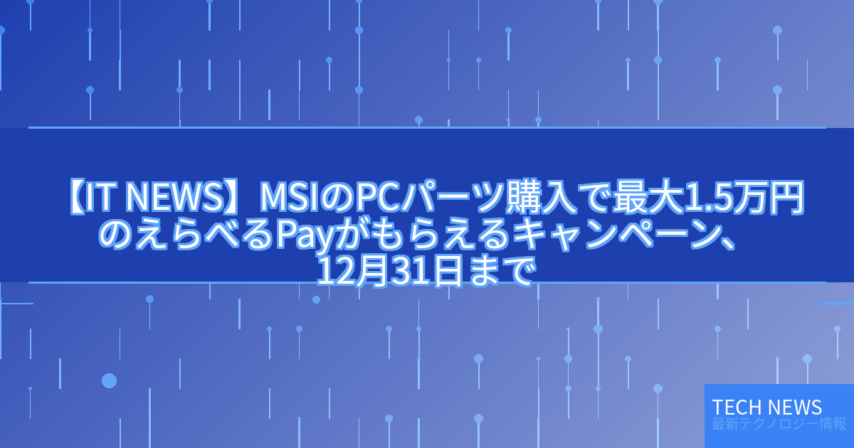 記事タイトル:MSIのPCパーツ購入で最大1.5万円のえらべるPayがもらえるキャンペーン、12月31日まで