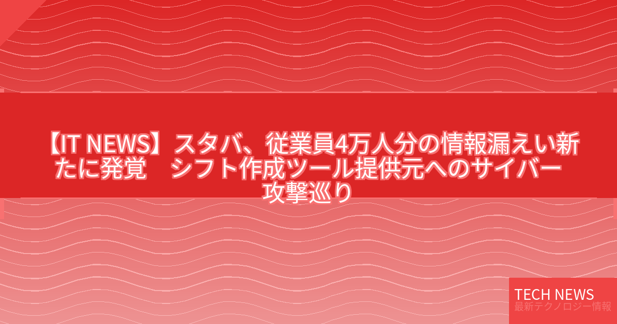 記事タイトル:スタバ、従業員4万人分の情報漏えい新たに発覚 シフト作成ツール提供元へのサイバー攻撃巡り