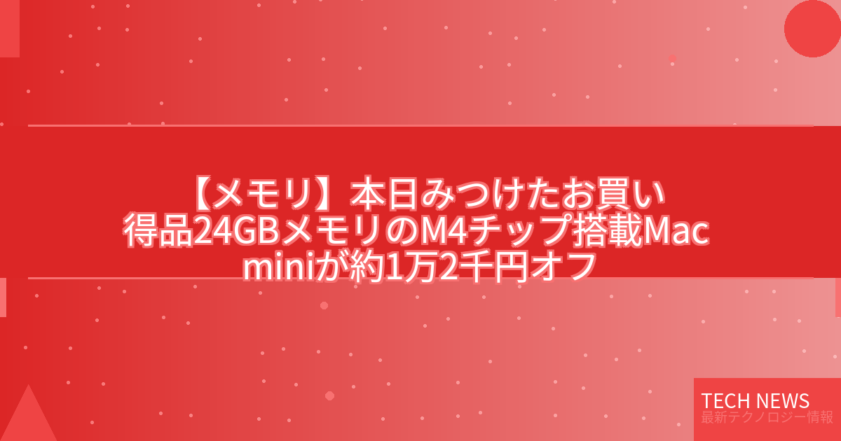 記事タイトル:【本日みつけたお買い得品】24GBメモリのM4チップ搭載Mac miniが約1万2千円オフ