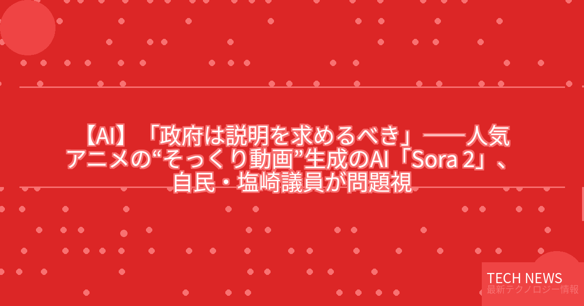 記事タイトル:「政府は説明を求めるべき」――人気アニメの“そっくり動画”生成のAI「Sora 2」、自民・塩崎議員が問題視