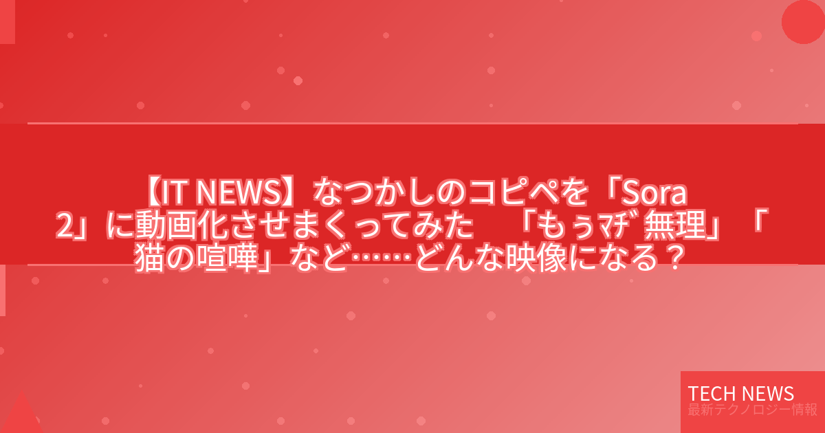 記事タイトル:なつかしのコピペを「Sora 2」に動画化させまくってみた 「もぅマヂ無理」「猫の喧嘩」など……どんな映像になる?
