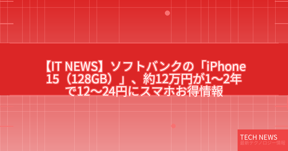 記事タイトル:ソフトバンクの「iPhone 15(128GB)」、約12万円が1~2年で12~24円に【スマホお得情報】