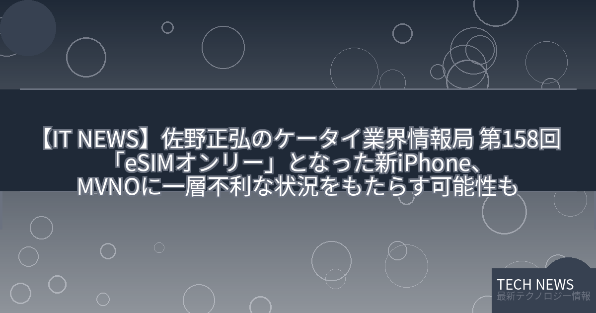 ・元記事タイトル:佐野正弘のケータイ業界情報局 第158回 「eSIMオンリー」となった新iPhone、MVNOに一層不利な状況をもたらす可能性も
