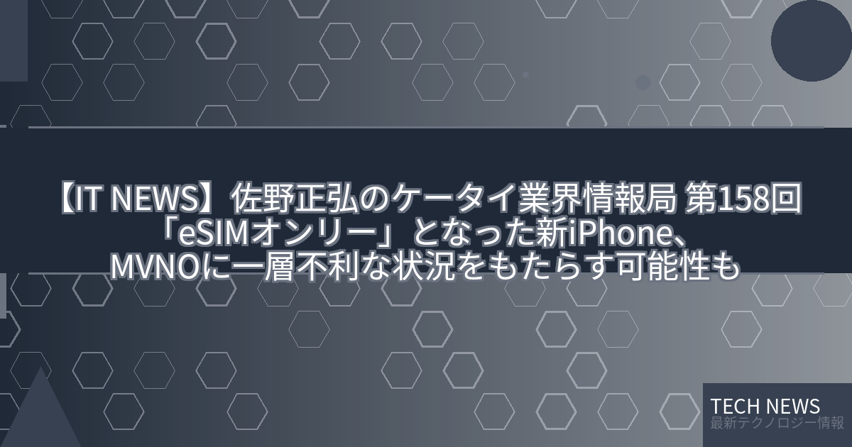 ・元記事タイトル:佐野正弘のケータイ業界情報局 第158回 「eSIMオンリー」となった新iPhone、MVNOに一層不利な状況をもたらす可能性も