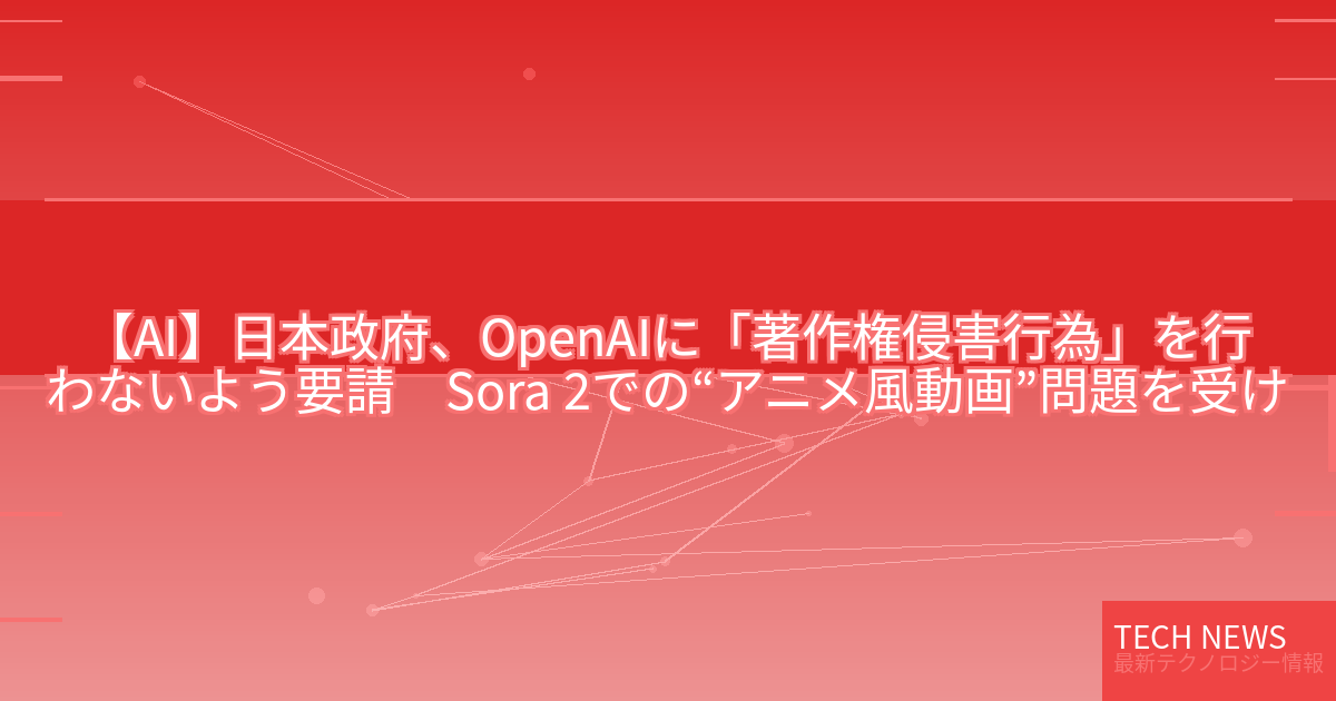 OpenAIの動画生成AI「Sora 2」で生成された、日本のアニメ作品に酷似した動画がSNS上に相次いで投稿されている問題を受け、政府がOpenAIに対して著作権侵害行為を行わないよう要請していたことが分かった。