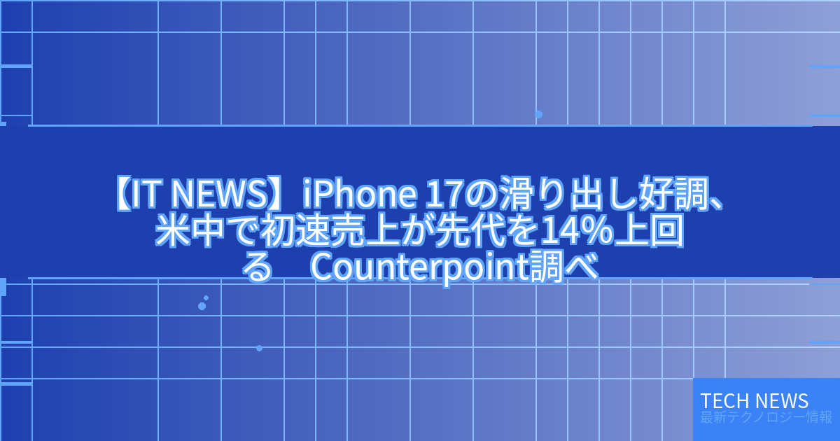 今回のニュースは、新型iPhone「iPhone 17」シリーズの初速売上が前年の「iPhone 16」シリーズを14%上回り好調な滑り出しを見せたことが報告されたものです。市場調査会社のCounterpointが、発売後10日間の米国と中国における売上実績を分析した結果、こうした数字が明らかになりました。