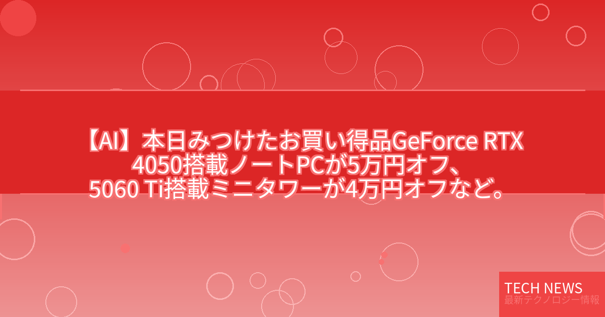 記事タイトル:【本日みつけたお買い得品】GeForce RTX 4050搭載ノートPCが5万円オフ、5060 Ti搭載ミニタワーが4万円オフなど。AmazonスマイルSALE