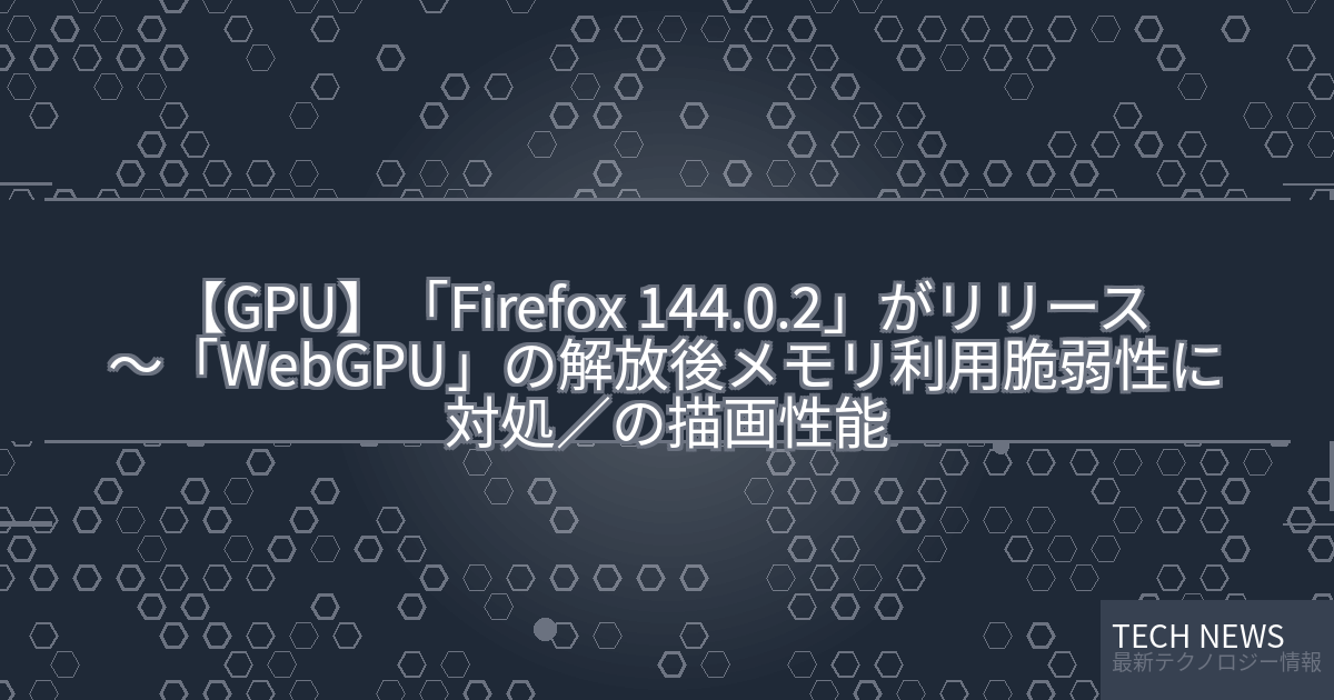 記事タイトル:「Firefox 144.0.2」がリリース ~「WebGPU」の解放後メモリ利用脆弱性に対処/