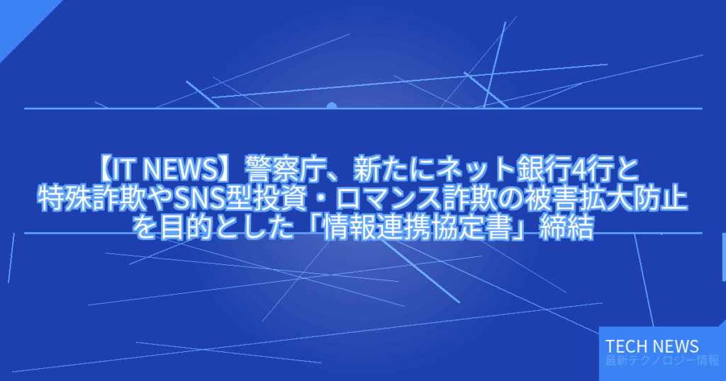 【IT NEWS】警察庁、新たにネット銀行4行と特殊詐欺やSNS型投資・ロマンス詐欺の被害拡大防止を目的とした「情報連携協定書」締結