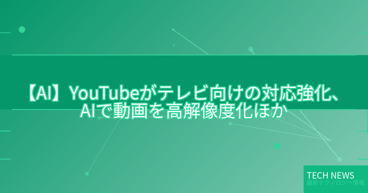 【AI】YouTubeがテレビ向けの対応強化、AIで動画を高解像度化ほか