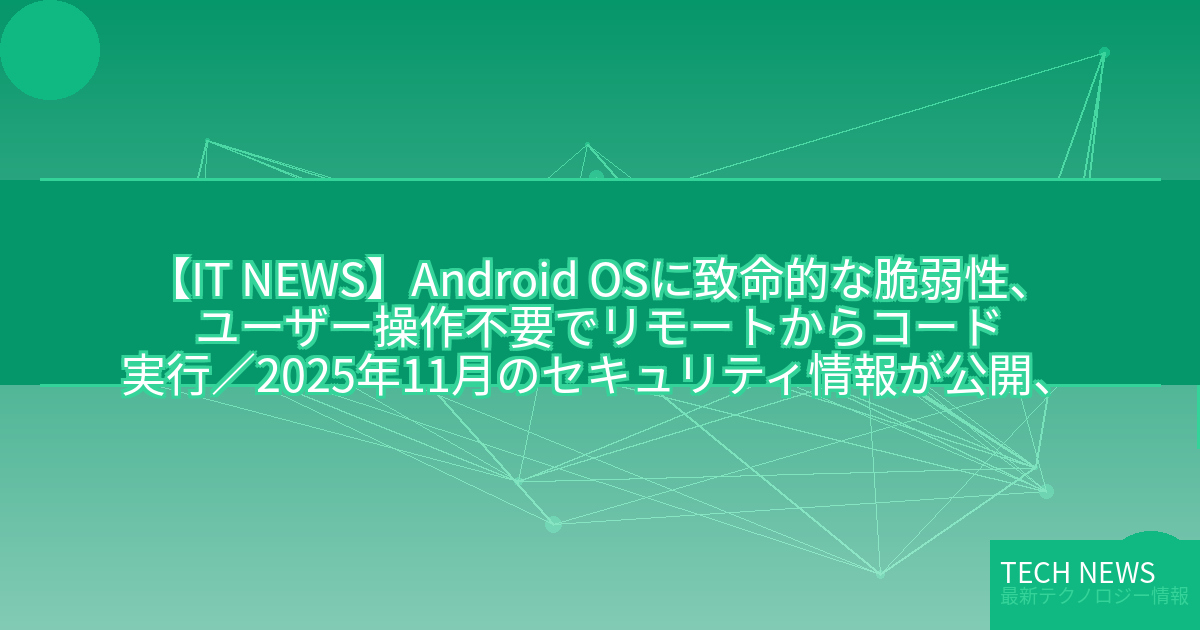 ・元記事タイトル:Android OSに致命的な脆弱性、ユーザー操作不要でリモートからコード実行/2025年11月のセキュリティ情報が公開、メーカーからパッチが提供され次第適用を