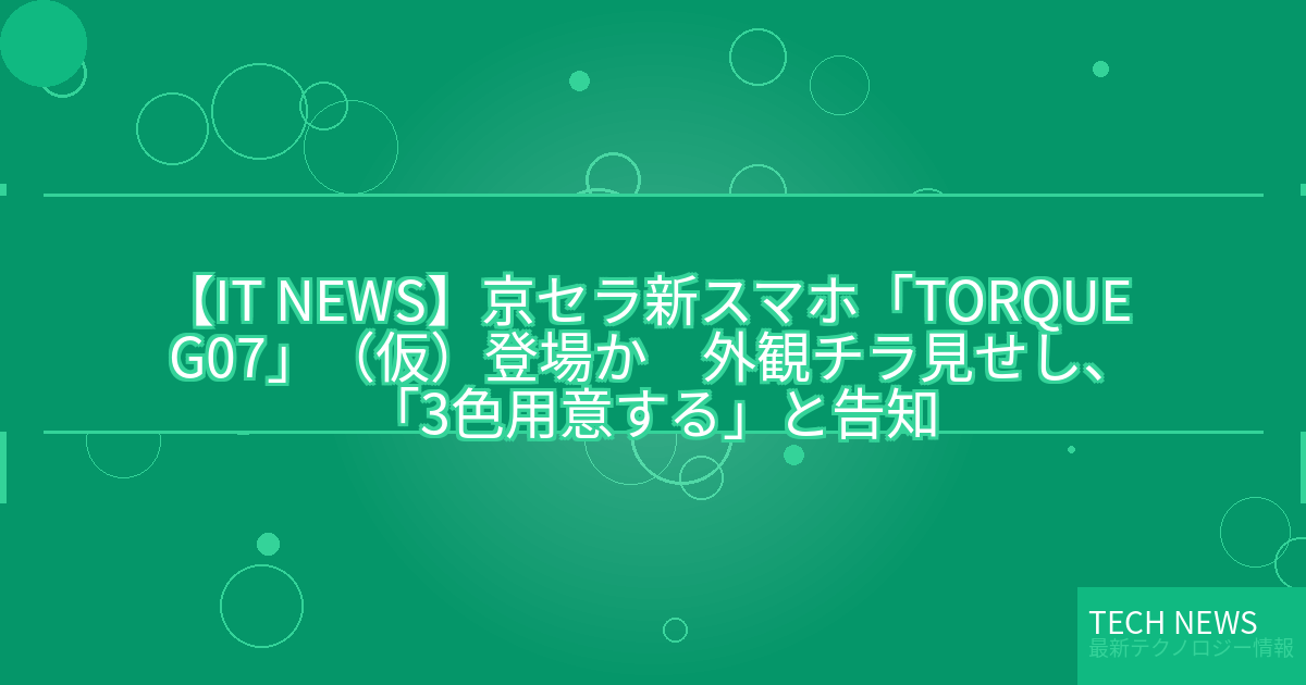 記事タイトル:京セラ新スマホ「TORQUE G07」(仮)登場か 外観チラ見せし、「3色用意する」と告知