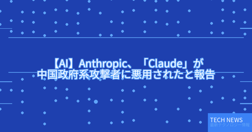 【AI】Anthropic、「Claude」が中国政府系攻撃者に悪用されたと報告