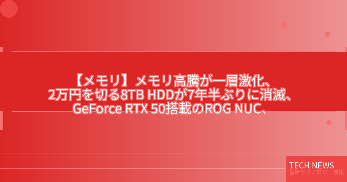 記事タイトル:メモリ高騰が一層激化、2万円を切る8TB HDDが7年半ぶりに消滅、GeForce RTX 50搭載のROG NUC、レトロゲーム機をUSB PD充電器に対応させるキット ほか 秋葉原の気になるニュース(11月24日~30日分)