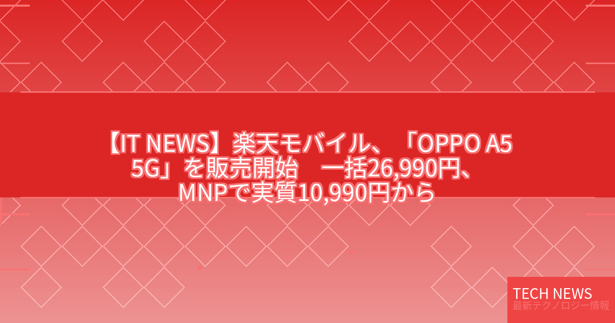 記事タイトル:楽天モバイル、「OPPO A5 5G」を販売開始 一括26,990円、MNPで実質10,990円から