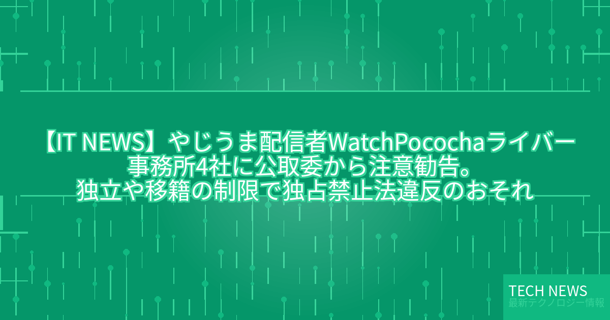 ・元記事タイトル:【やじうま配信者Watch】Pocochaライバー事務所4社に公取委から注意勧告。独立や移籍の制限で独占禁止法違反のおそれ
