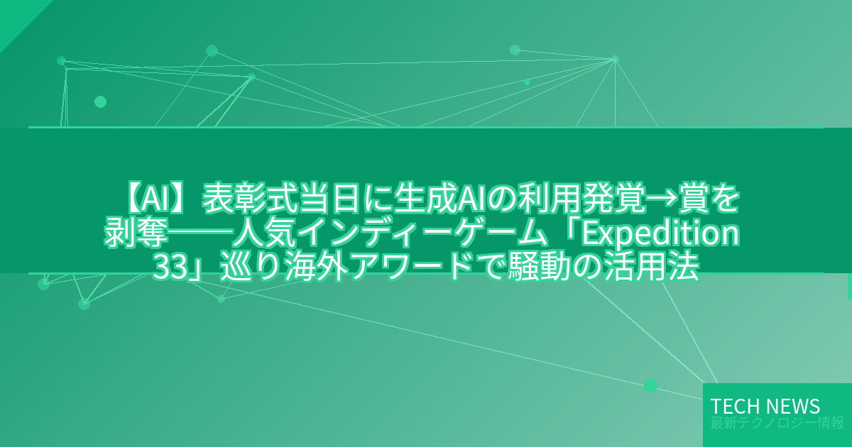 記事タイトル:表彰式当日に生成AIの利用発覚→賞を剥奪──人気インディーゲーム「Expedition 33」巡り海外アワードで騒動