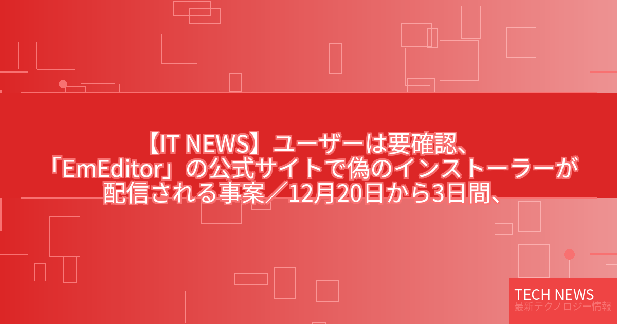 ・元記事タイトル:ユーザーは要確認、「EmEditor」の公式サイトで偽のインストーラーが配信される事案/12月20日から3日間、リダイレクト設定が不正に書き換えられる