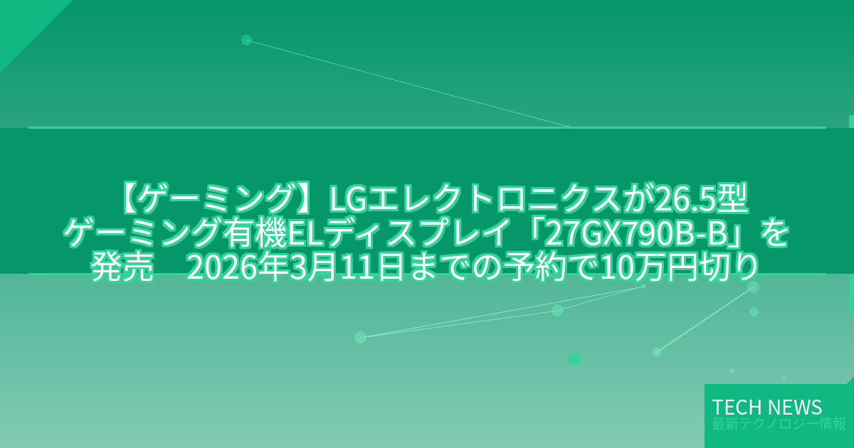 記事タイトル:LGエレクトロニクスが26.5型ゲーミング有機ELディスプレイ「27GX790B-B」を発売 2026年3月11日までの予約で10万円切り