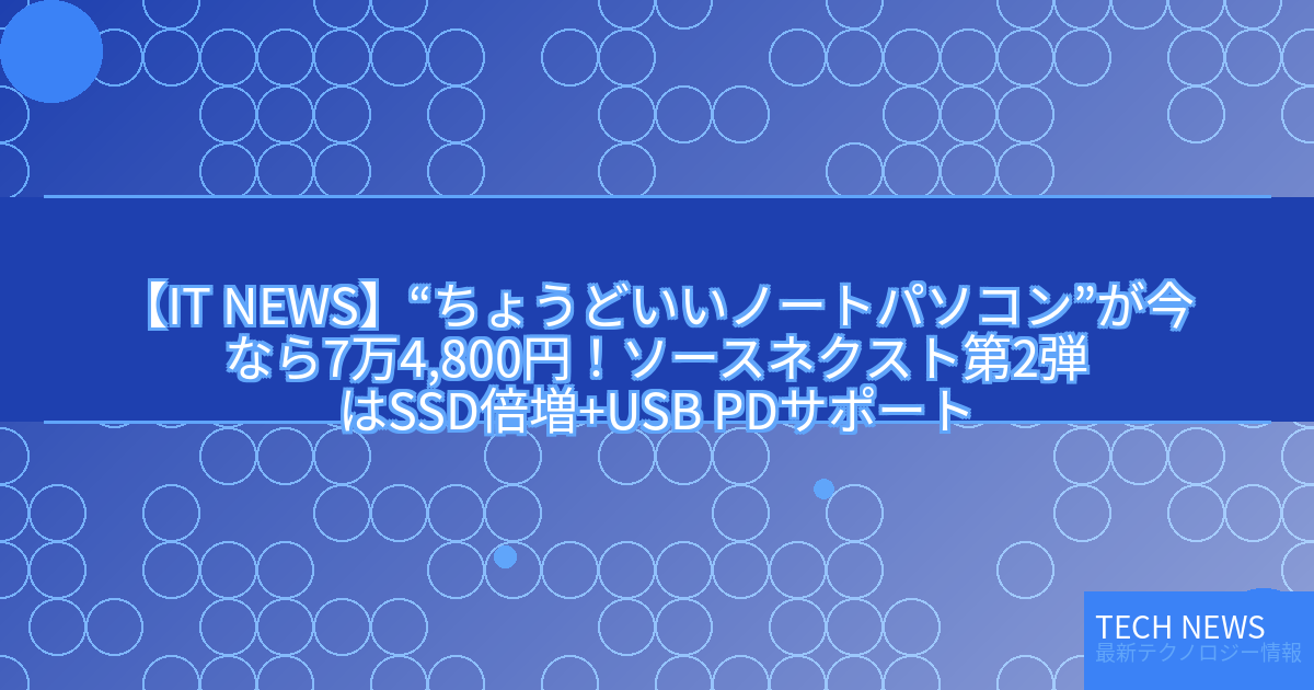 ・元記事タイトル:“ちょうどいいノートパソコン”が今なら7万4,800円!ソースネクスト第2弾はSSD倍増+USB PDサポート