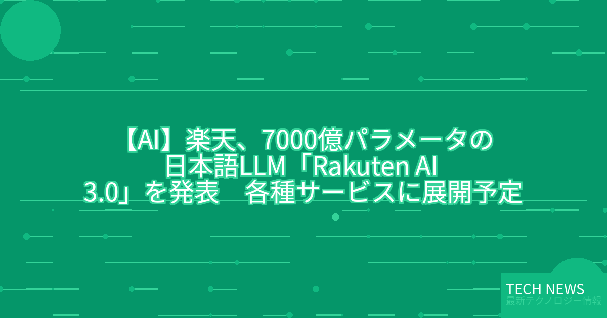 ・元記事タイトル:楽天、7000億パラメータの日本語LLM「Rakuten AI 3.0」を発表 各種サービスに展開予定