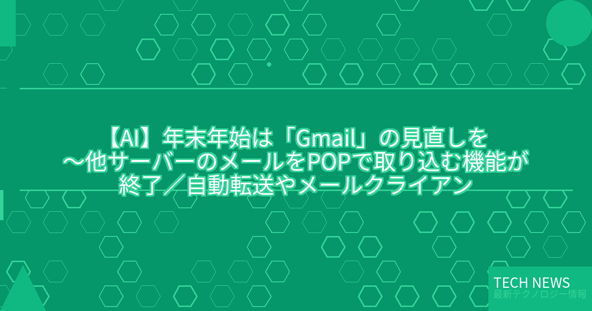 ・元記事タイトル:年末年始は「Gmail」の見直しを ~他サーバーのメールをPOPで取り込む機能が終了/自動転送やメールクライアントへのアカウント追加で対処可能
