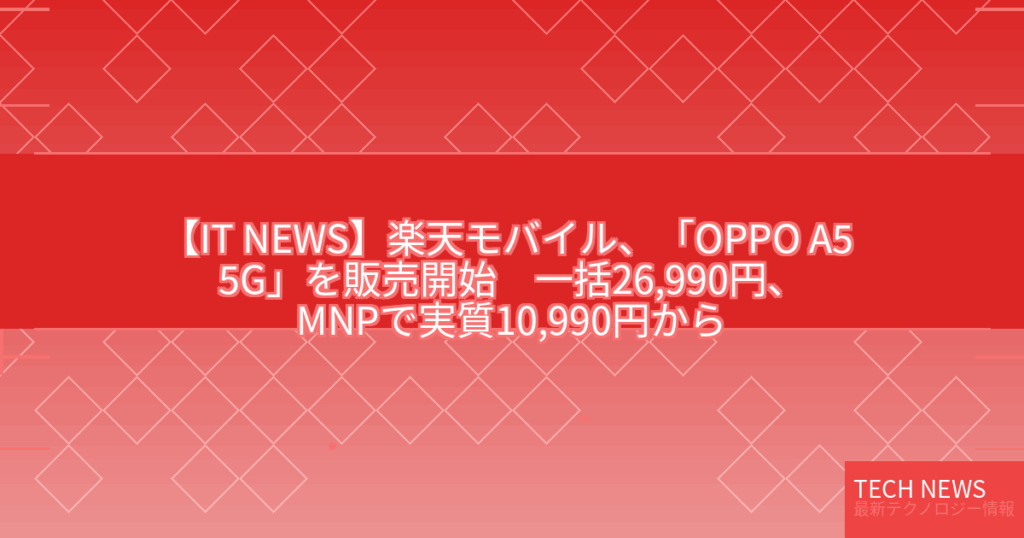 【IT NEWS】楽天モバイル、「OPPO A5 5G」を販売開始 一括26,990円、MNPで実質10,990円から