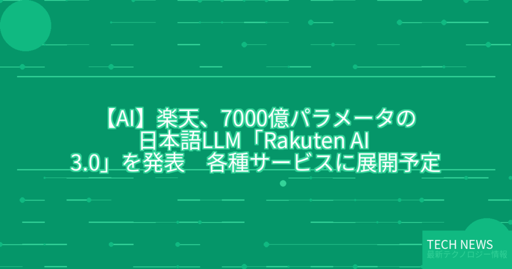 楽天が日本語特化LLM「Rakuten AI 3.0」を発表した。MoE採用で性能と計算効率を両立し、日本語版MT-Benchで高得点を記録している。GENIAC支援のもと自社サービスへ導入する他、来春にはオープンウェイトモデルとしての公開を予定している。