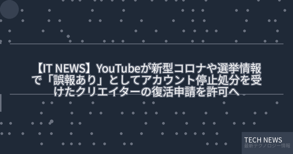 【IT NEWS】YouTubeが新型コロナや選挙情報で「誤報あり」としてアカウント停止処分を受けたクリエイターの復活申請を許可へ