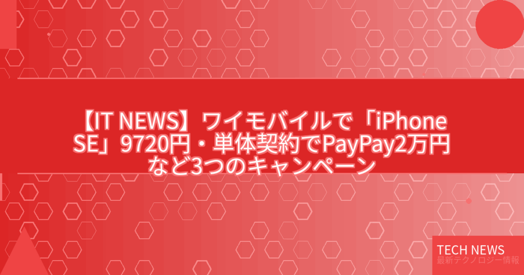 【IT NEWS】ワイモバイルで「iPhone SE」9720円・単体契約でPayPay2万円など3つのキャンペーン