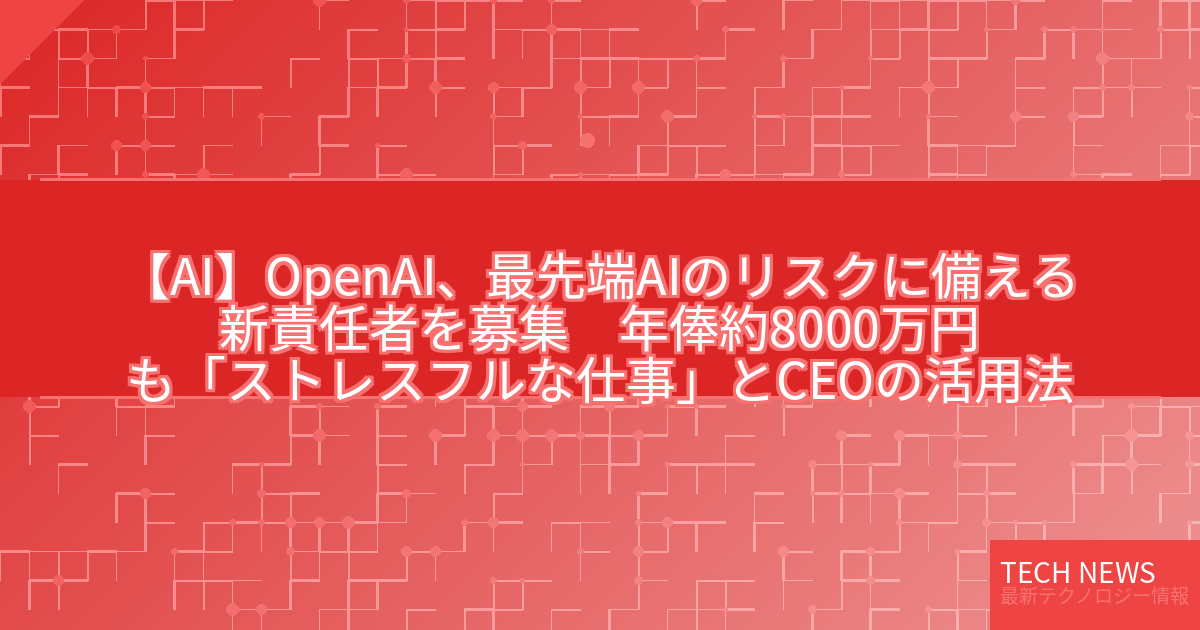 記事タイトル:OpenAI、最先端AIのリスクに備える新責任者を募集 年俸約8000万円も「ストレスフルな仕事」とCEO