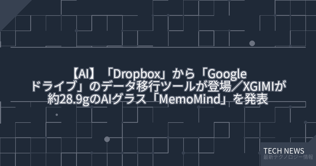 【AI】「Dropbox」から「Google ドライブ」のデータ移行ツールが登場/XGIMIが約28.9gのAIグラス「MemoMind」を発表
