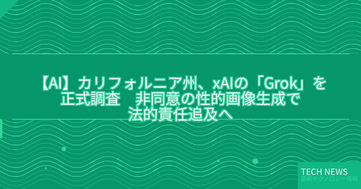 記事タイトル:カリフォルニア州、xAIの「Grok」を正式調査 非同意の性的画像生成で法的責任追及へ