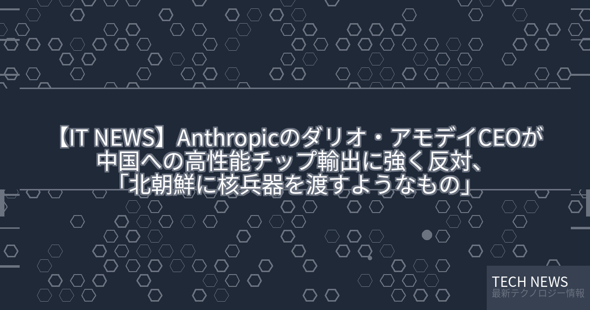 記事タイトル:Anthropicのダリオ・アモデイCEOが中国への高性能チップ輸出に強く反対、「北朝鮮に核兵器を渡すようなもの」