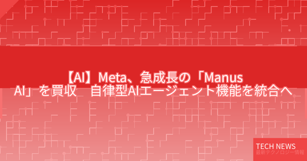 Metaは、中国発でシンガポール拠点の汎用AIエージェント開発企業Manus AIを買収すると発表した。Manusは自律型タスク遂行に強みを持ち、8カ月で売上高1億ドルを達成した急成長スタートアップだ。Metaはこの技術を「Meta AI」などの自社プロダクトに統合し、シャオ・ホンCEOらと共に、数... -
